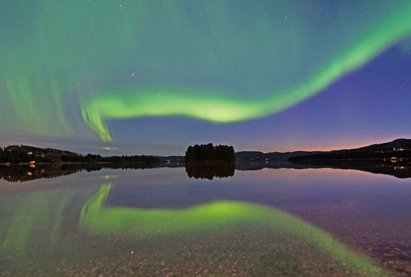 瑞典北部西諾爾蘭省(Vaesternorrland)村鎮埃里克斯隆德(Erikslund)出現的北極光與湖中的倒影相映成趣。攝於2016年8月23日。(AFP)