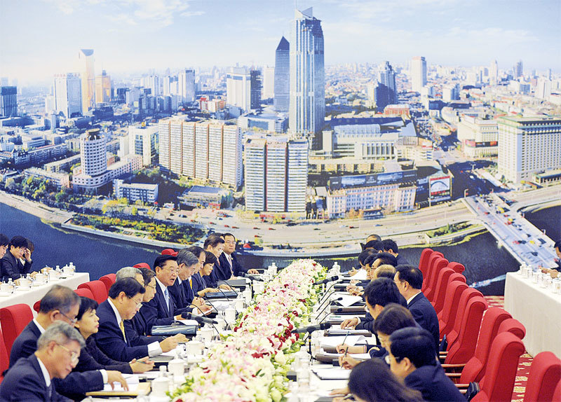 2008年國民黨執政後,兩岸交流更為頻繁,中共計畫以200萬大陸臺商為在臺灣組建社會民主黨的基本資源。圖為2011年10月,臺灣海基會成員赴天津與大陸海協會進行兩岸談判。(Getty Images)