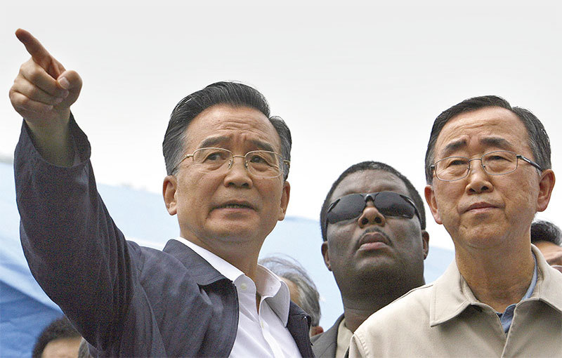 2008年5月12日汶川地震,時任中共總理溫家寶因無法調動江派軍隊而震怒。圖為溫家寶(左)陪同聯合國祕書長潘基文巡視災區。(AFP)