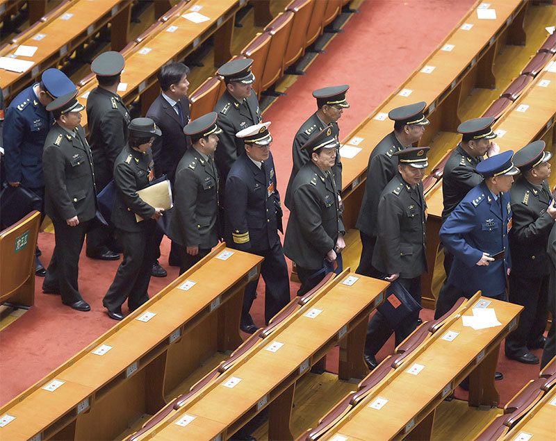 中共省級「戎裝常委」消失一年後重現,表明習近平的軍隊改革基本到位。軍改的真正目的是清洗軍中的江派勢力。圖為2015年3月5日參加中共兩會的「戎裝常委」。(AFP)
