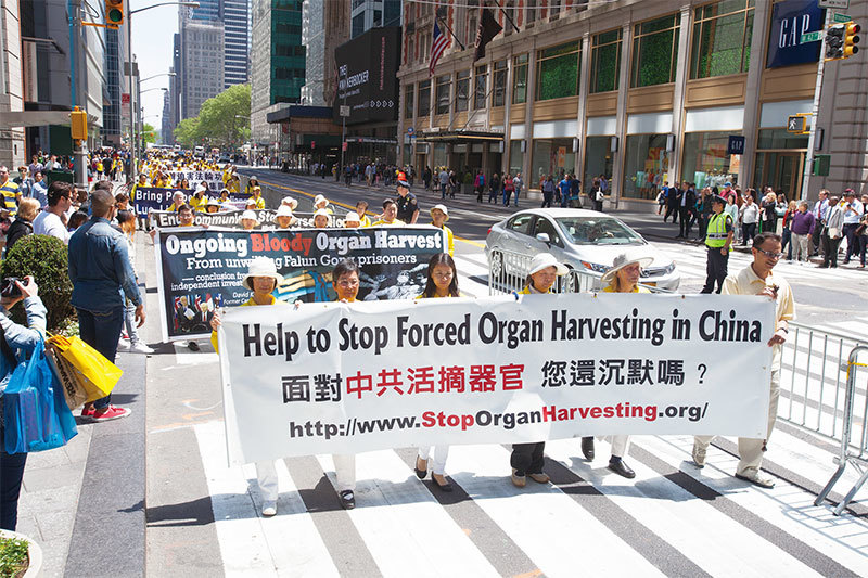 中共江澤民集團迫害法輪功18年,已對中國社會的經濟、法制、道德等多方面造成致命傷害。圖為2015年5月16日逾8000人紐約大遊行中的「停止迫害法輪功」方陣。(季媛/大紀元)