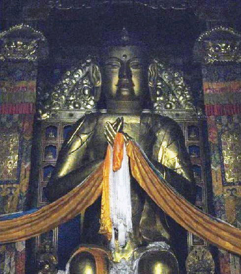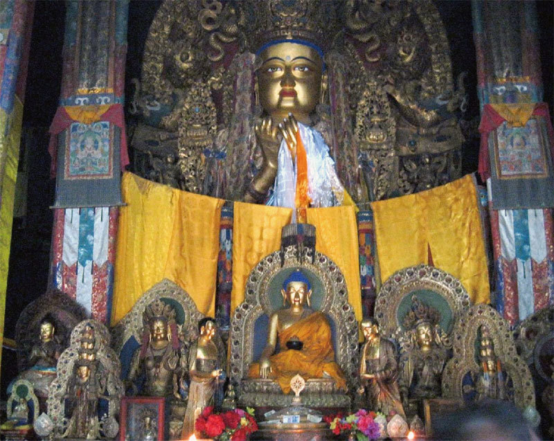 當時,在大金瓦殿,導遊喇嘛指著大佛像對遊客說:「這是彌勒佛、也稱『未來佛』,佛像是二世寺主特邀尼泊爾工匠鑄造的。這尊彌勒佛像手拿著『法輪』,表示『未來佛』將帶著『法輪』和八大金剛下世度人。」然後,導遊指著大佛前下方的小佛像說:「這是釋迦牟尼佛、也稱『現在佛』,他和『未來佛』一前一後下世拯救蒼生。」
