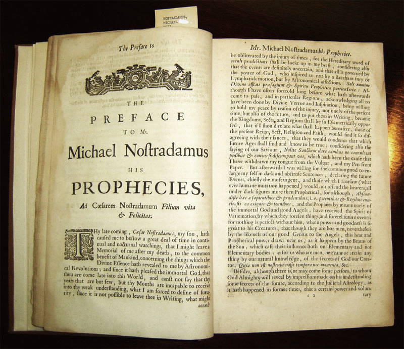 諾查丹瑪斯所著《百詩集》(《諸世紀》)1672年英譯本,收藏於美國德克薩斯大學安東尼奧健康科學中心的P.I.Nixon醫學歷史圖書館。(公有領域)