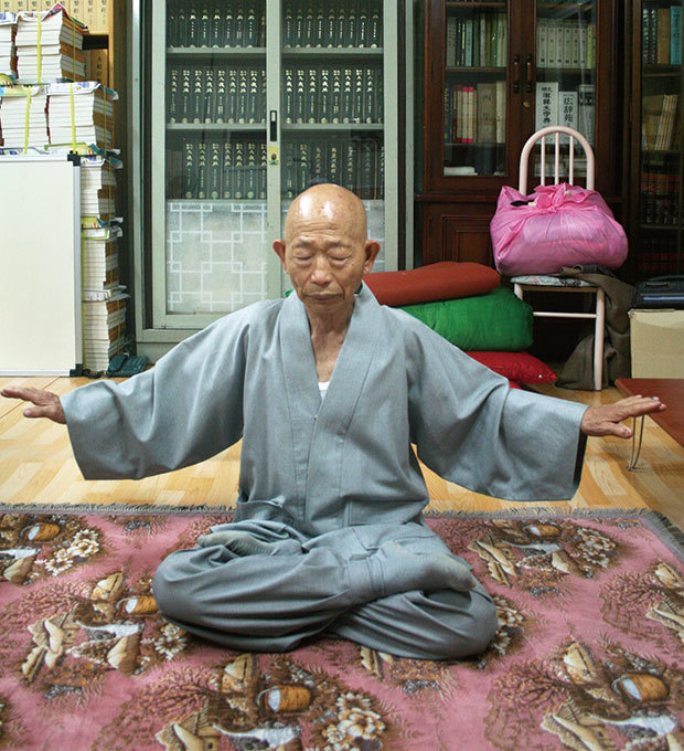 韓國僧人吳永圭正在煉法輪功第五套功法──神通加持法。(明慧網)
