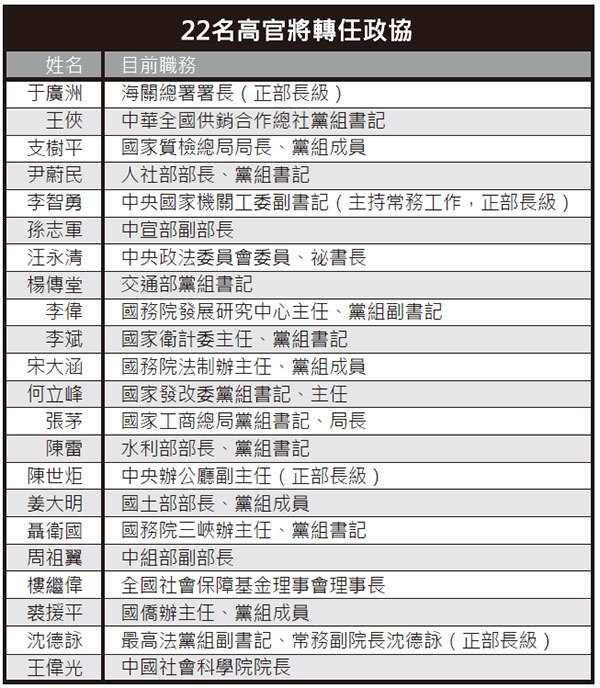 另外,現任中央和國家機關領導共有22人(詳表)列入全國政協委員名單,意味著他們即將卸職,轉而擔任政協閒職。