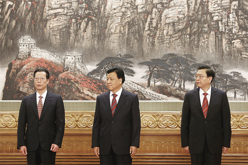 王岐山以退為進,以與江派三常委張德江(右)、劉雲山(中)、張高麗(左)同歸於盡的方式,為習近平贏得政治空間。(Getty Images)