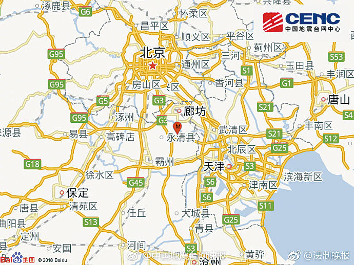 據中國地震臺網消息,震中周邊人口密集,有感範圍較大。震中距離北京城區約65公里,距廊坊市19公里,距天津市56公里。