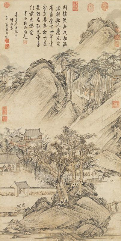 明代袁尚統〈歲朝圖〉畫的是山村人家的新年歲景。山村一角,有幾戶人家,在元旦和樂輕鬆地慶新年,也請來老友共享壽席。