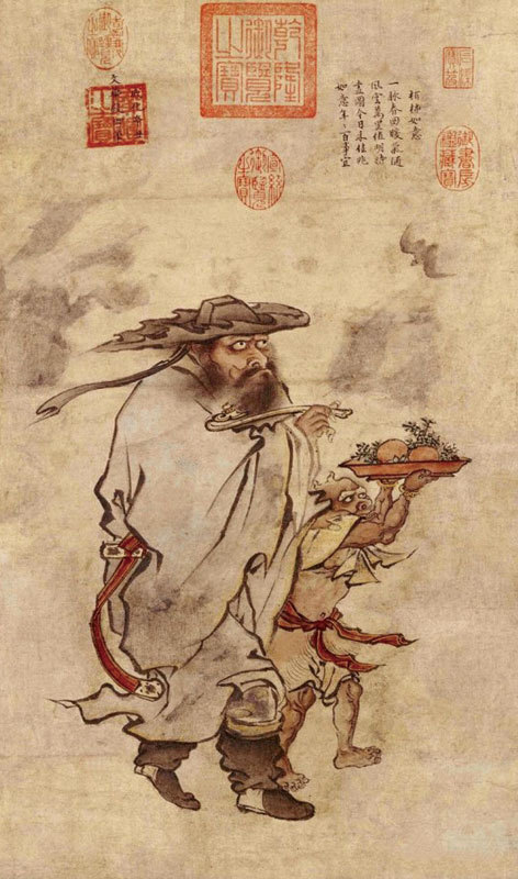 因為鍾馗是鎮鬼大師,他身旁被他整治得服服貼貼的小鬼,高舉一個裝有柏枝和柿子的圓盤,背景還畫了一隻飛翔中的蝙蝠。這些都是特意安排的,擷其諧音,形成「百事如意」「福字當頭」等等祥瑞意涵。