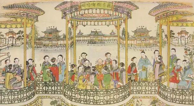 清朝姚文翰〈歲朝歡慶圖〉,描繪的是清朝時代一個大戶人家在過年時,闔家歡慶團圓的場景。畫家以「俯瞰法」透過描繪各類活動,將新年節慶歡樂的氣氛描繪得淋漓盡致。