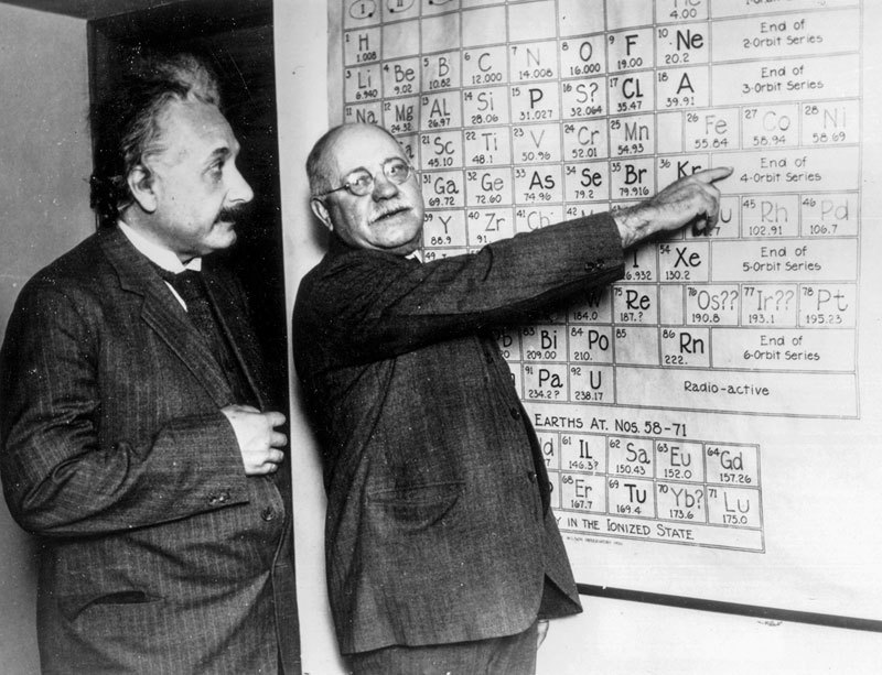 元素周期表並非實驗的結果,而是來自門捷列夫的一個夢。圖為愛因斯坦(左)1931年2月18日在美國加州與天文學家探討化學元素周期表。(Hulton Archive)