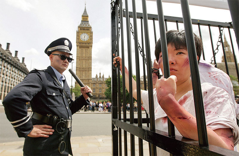 江澤民發動迫害法輪功後,中共外交部在海外通過使領館,散布詆毀法輪功的宣傳,向西方主流社會、媒體、政要等灌輸對法輪功的仇恨。圖為倫敦國會大廈外的法輪功學員受迫害酷刑演示。(AFP)