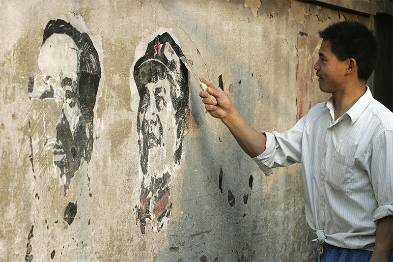 有評論認為,中國已從終身任期制度中吸取深刻教訓,不可能重蹈終身制。圖為上海一牆面的毛像及文革圖騰被清除。(Getty Images)