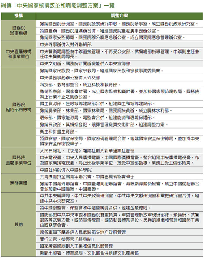 其後網上開始流傳長達1.5萬字的「中央國家機構改革和職能調整方案」。這一網傳方案顯示,改革後的國務院組成部門為19個,少於過去的25個。而改革後的中央直屬機構為9個,包括:中央辦公廳、中宣部、中組部、統戰部等。