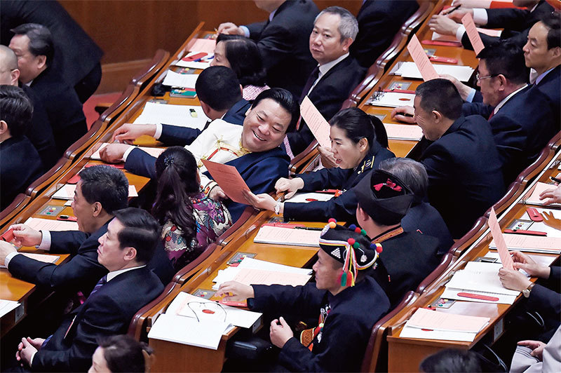 在中共一黨專制的體制下,人大被稱為「舉手機」。圖為3月11日人大投票通過中共憲法修正案草案。(AFP)