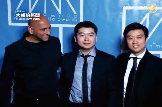 2012年11月15日,陳東(中)和《自由中國》的導演兼製片人Michael Perlman(左)及製片人Kean Wong,參加好萊塢影視音樂大獎在洛杉磯芳達劇院的頒獎典禮。(新唐人)