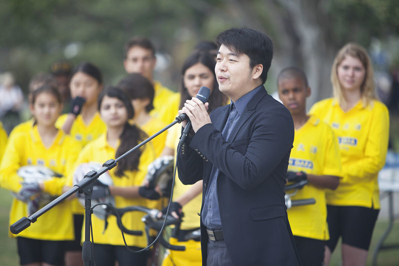 2015年6月一個旨在營救法輪功學員遺孤的橫穿美國單車之旅「騎向自由」(Ride to Freedom)在洛杉磯聖莫尼卡碼頭集會,陳東於現場演唱聲援。(大紀元)