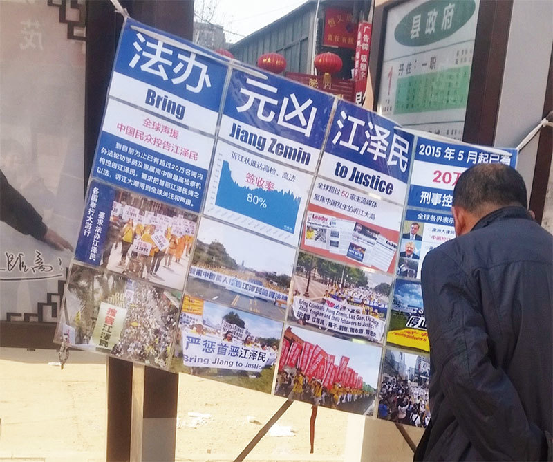 紅二代羅宇質問中共當局,已經說了「有案必立」,那20萬人告江澤民,兩高為何不立案?這需要對人民做出一個交代。圖為大陸民眾詳看訴江真相展板。(明慧網)
