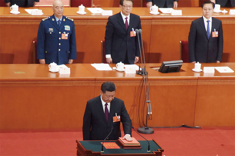 3月17日,首次在全國人大會上舉行憲法宣誓活動,誓詞強調「忠於祖國、忠於人民」,而未提「忠於黨」。圖為習近平對憲法宣誓就任。(Getty Images)