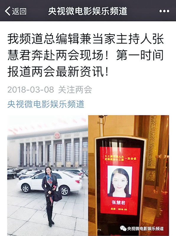 未想到一個月後就搖身一變成了美國的全美電視臺記者,採訪今年兩會。但網民隨即發現,張慧君同時還擔任央視微電影娛樂頻道的總編輯兼當家主持報導本屆兩會,也就是說,她同時替兩個單位報導兩會,可謂身兼多職。