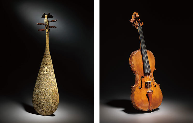提琴旁邊的琵琶源自中國明代,琵琶的背面,鑲嵌著110片象牙製的圖案,上面描刻了佛教、道教和儒家的神仙和人物,如道家福祿壽中的壽仙,以及象徵著繁榮與福氣的圖形。與現今的鋼絲弦的琵琶不同,這把明代琵琶為絲弦,音色更為渾厚,音質更純。