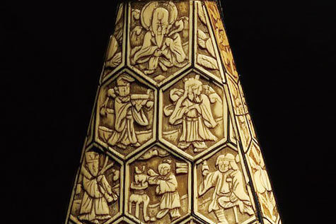 明代琵琶的背面,刻劃了儒釋道的人物圖案。(大都會博物館提供)