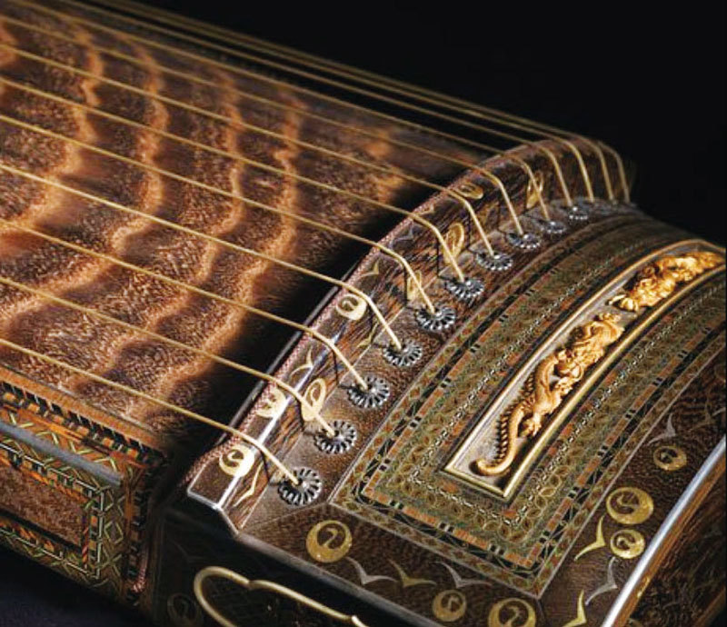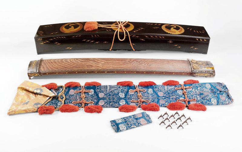展覽的另一亮點,是烏丸光廣獲贈的古琴。江戶時代的日本,武士烏丸光廣從被圍困的城池中,救下了自己的岳父,光廣的舅兄問他想要什麼禮物作為答謝,烏丸光廣說,他想要一把古琴(koto)。當時日本的古琴大都材質樸素,而光廣沒有想到,自己會得到一件如此美麗的贈物:琴上金銀雙色,繪製了60隻仙鶴,周邊還有野鶴翩飛、蓮花出水的圖案,琴頭則是一幅雕刻精緻的雙龍,鑲著金箔的玳瑁,音板被雕琢成流水般的形狀。