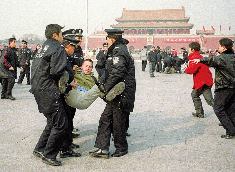 1999年7月20日江澤民下令鎮壓法輪功。于宙開車送學員到天安門上訪,晚上演出後往家拉「違禁」的書和資料,總感覺警車在後面跟著。圖為法輪功學員在北京天安門廣場被抓捕。(AFP)