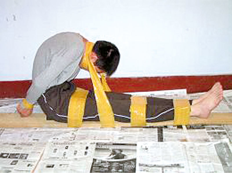 一個與于宙同監室的在押人在2011年出現,聲稱見證了于宙在看守所最後的日子,說于宙受的苦不是人受的。圖為中共「捆綁」酷刑迫害演示圖。(明慧網)