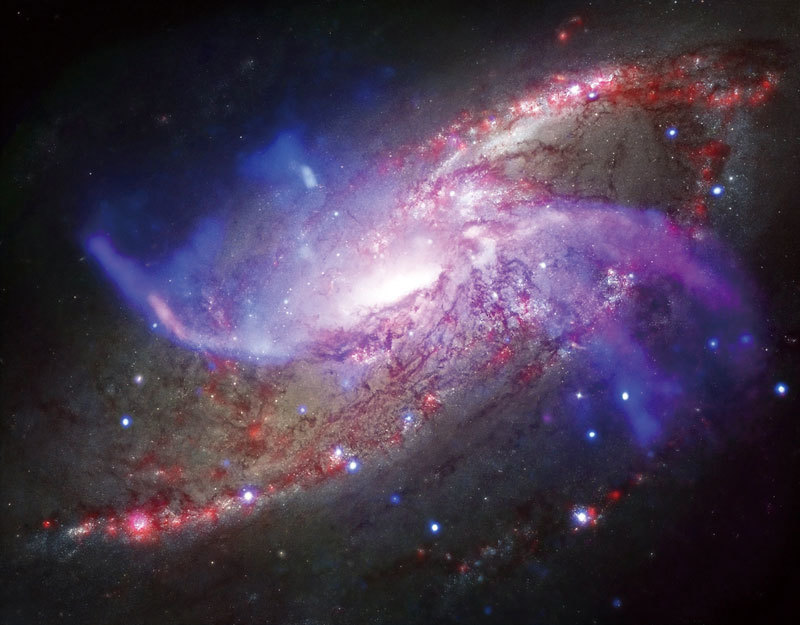 星系旋轉的壯觀景象。此為X射線、紅外線、無線電波及可見光的合成圖,顯示2300萬光年遠的星系NGC 4258發生的變化。(NASA)
