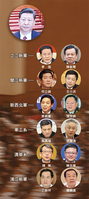 習近平在拿下大量江派高官的同時,重用在福建、浙江、上海等地任職時的舊部,以及清華系校友、老家陝北官員,建立了「之江新軍」、「閩江新軍」、「新西北軍」、「軍工系」、「清華系」、「浦江新軍」等親信班底。