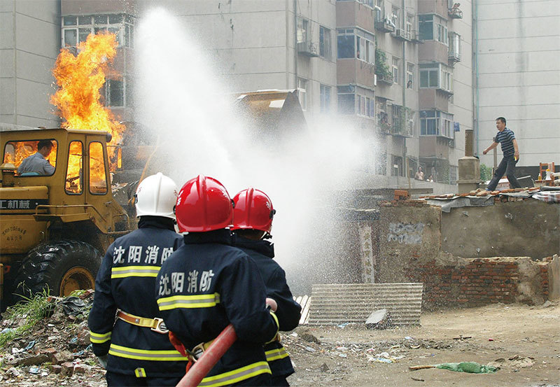 中共公安部的權力已被分解。最新的行政機構改革中,公安消防部隊已經與武警森林部隊一起,轉制國務院下屬應急管理部。圖為公安消防隊在瀋陽一男子反抗強拆現場。(Getty Images)