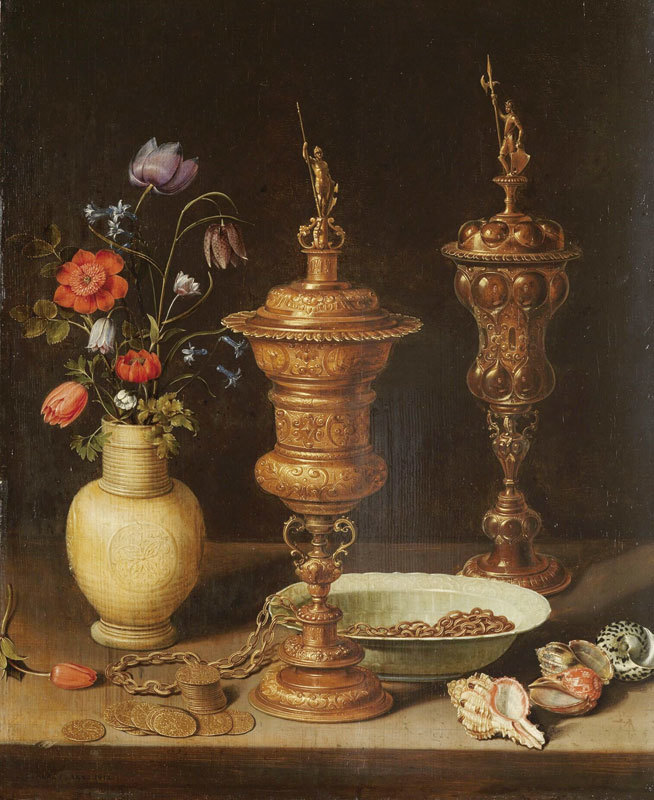 一個花瓶,幾個貝殼,漂亮雕琢的銀器……這毋庸置疑是一幅優雅的古典風格的靜物畫,是17世紀歐洲富裕的中產階級家中常見的收藏品,也屬於當時非常受歡迎的風俗畫之一。