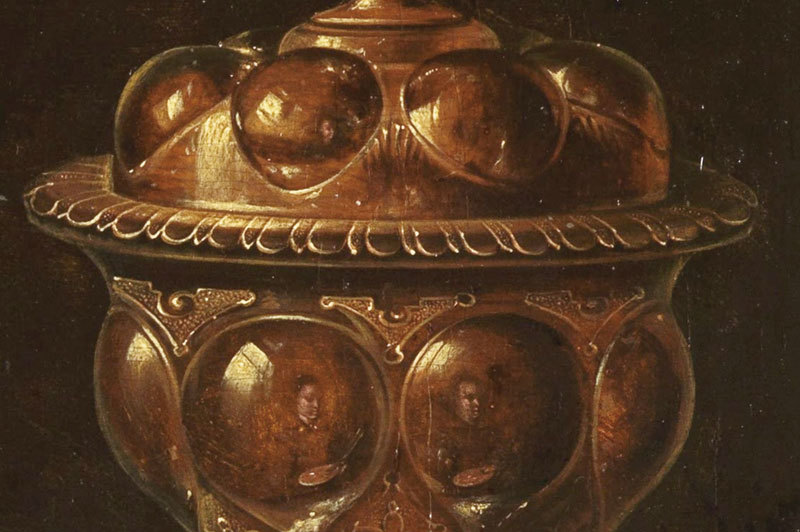 也就是在這些精密描繪的反光面上,畫家巧妙、幾乎不著痕跡地留下了許多小小自畫像,就如同低調的簽名落款一般。對觀眾而言,則是「找找看」的遊戲!一幅又一幅,我們發現畫家的倩影伸縮自如地變形在金屬瓶蓋上、錫壺罐子的凸部等等。
