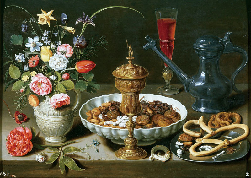 克拉拉.琵特斯(Clara Peeters)〈有花與銀器的靜物〉,1612年,木板油畫,卡爾斯魯厄國家藝術館藏。(公有領域)