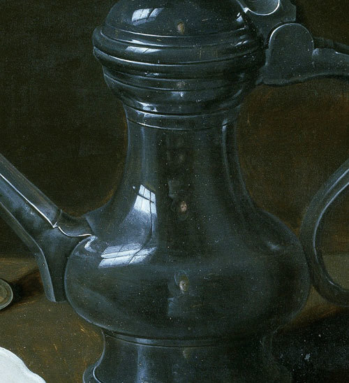克拉拉.琵特斯〈桌面,藝術家在杯與水壺上的反影〉,1611,木板油畫,馬德里普拉多美術館。(公有領域)
