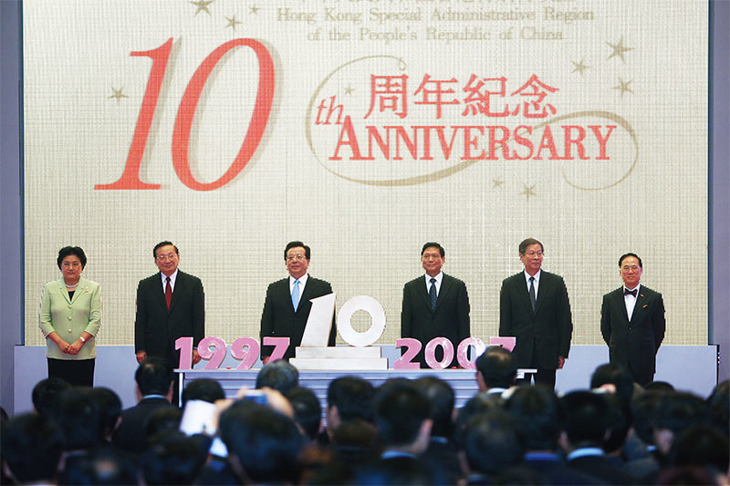 江澤民集團二號人物曾慶紅(左三)長期在香港培植親信勢力,操控香港黑白兩道。圖為2007年香港回歸10周年活動。(Getty Images)
