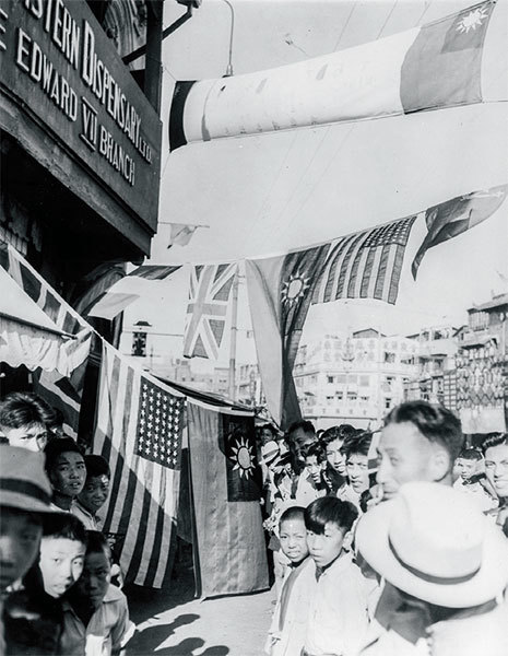 1945年9月6日,上海民眾在二戰結束時為慶祝日本戰敗而在街頭串起中華民國及美、英等同盟國國旗。(Hulton Archive /Getty Images)