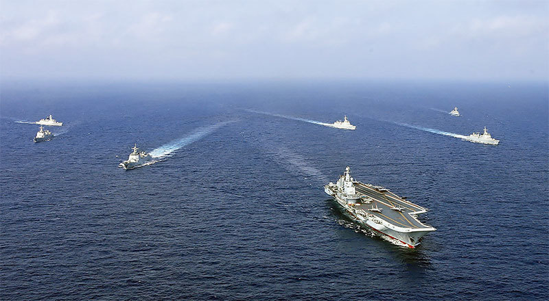 2016年以來,中國海軍艦隊多次突破第一島鏈進行遠程演習。遼寧艦航母群,多次穿越臺灣海峽。圖為2018年4月遼寧艦(前方)在東海「實戰演習」。(AFP)