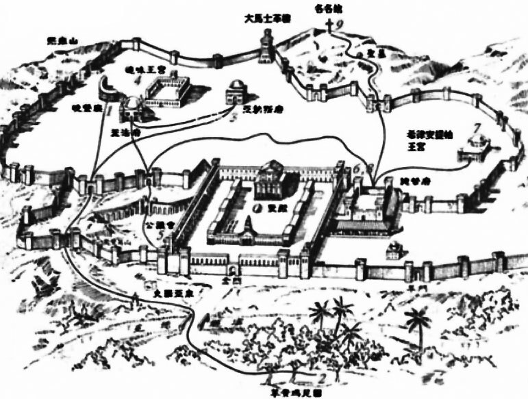 耶穌最後一次在耶路撒冷的路徑圖,西方在圖的上方。(視頻截圖)