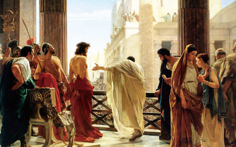 〈瞧,這個人〉彼拉多詢問猶太人是否釋放耶穌,Antonio Ciseri。(公有領域)