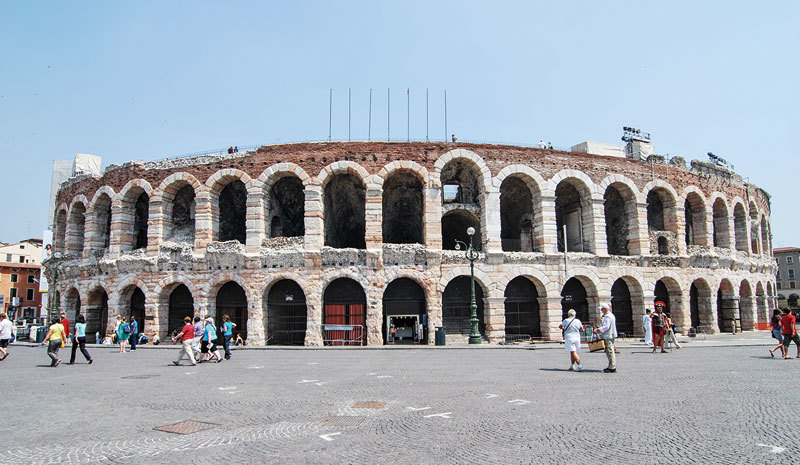 維羅納圓形劇場,位於意大利北部,是少數保持完好且仍在使用的羅馬時期競技場,每年舉辦的歌劇節聞名全球。(公有領域)