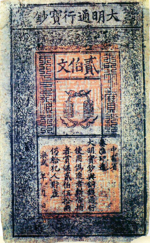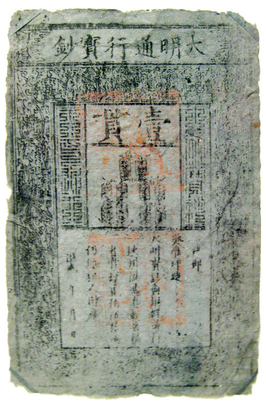 大明紙鈔正面加蓋兩方紅色官印,分別是大明寶鈔之印、寶鈔提舉司印。圖為大明通行寶鈔。(公有領域)