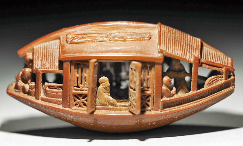 明朝紙幣上出現一項絕巧的工藝——微雕。微雕技師一般多精通繪畫、書法、雕刻等藝術。圖為清乾隆二年陳祖章雕橄欖核舟(底刻〈後赤壁賦〉全文)。(公有領域)
