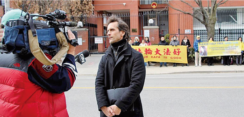 4月8日多倫多中領館前,契布卡呼籲中共釋放遭關押一年多、面臨非法審判的加籍法輪功學員孫茜,並接受加拿大主流媒體City的採訪。(大紀元)