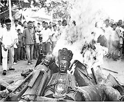 魔鬼毀滅人類的主要方式是切斷人和神的聯繫,破壞神傳給人的文化,敗壞人的道德,把人變異到神難以挽救的程度。圖為文化大革命焚燒佛像。(網路圖片)