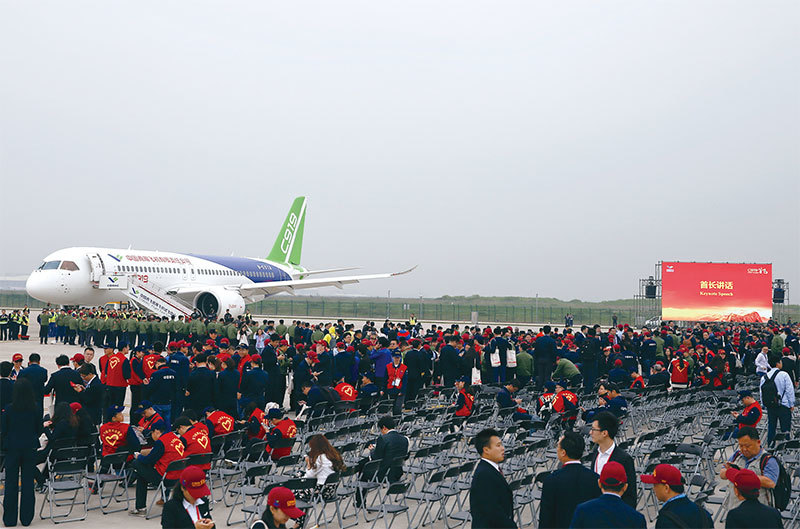 美國或將徵收與「中國製造2025」計畫有關的商品25%關稅。圖為去年5月5日中共國產飛機C919首飛,被視為「中國製造2025」的一劑強心針。(AFP)
