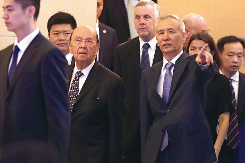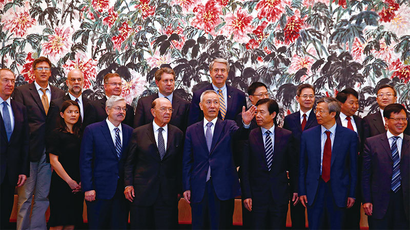 美國商務部長羅斯(前排左三)6月2日抵達北京,展開和中國的第三輪貿易談判。3日談判結束時,雙方並未就此次談判發表聯合聲明。(AFP)