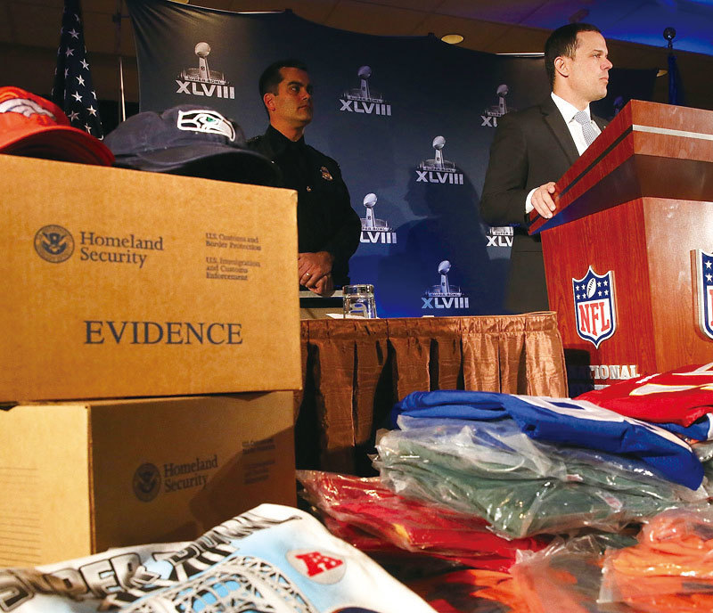 中共盜竊美國的知識產權,每年造成美國業者損失數十億美元;美國查獲的仿冒商品87%來自中國。圖為美國移民和海關執法局等官員展示來自中國的大量假冒品。(Getty Images)
