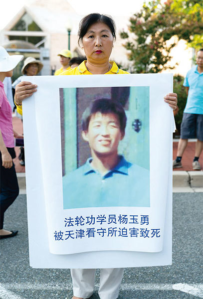 2017年8月4日,美國華盛頓特區的部分法輪功學員在中共大使館門前舉行集會,譴責中共使用酷刑迫害法輪功學員楊玉勇並致其死亡。(石青雲/大紀元)